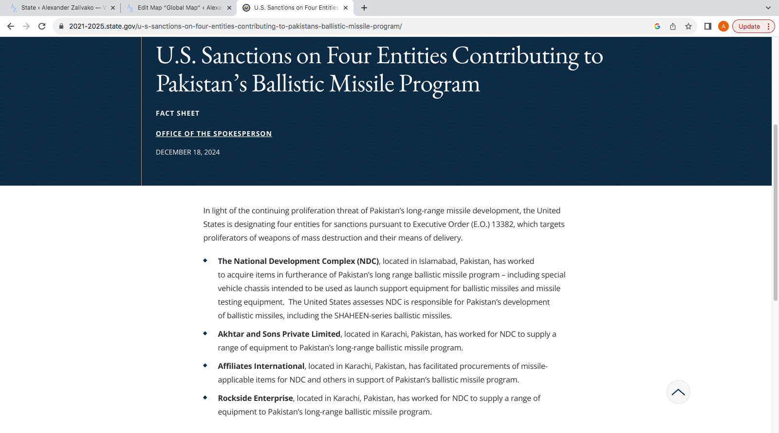 2024.12.18 – US Sanctions on Four Entities Contributing to Pakistan’s Ballistic Missile ProgramDocuments / By Alexander Zalivako Attached are the relevant designations. Screen Shot 2025-08-21 at 13.25.05Download
