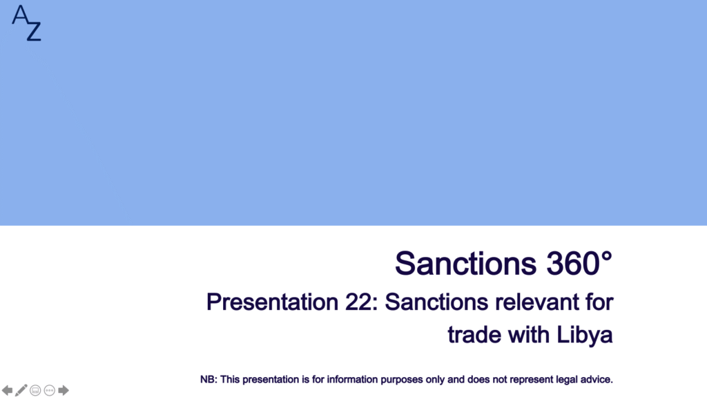 In this video we expand the geographical scope of our series Sanctions 360° by looking at the current sanctions regime which is relevant for trading with Libya. Libya is an important country in global crude oil supply. It has also substantial amounts of sovereign assets frozen with Western financial institutions which Libya wants to manage for a wider benefit of its people. Finally, as a close neighbour of the EU, co-operation with Libya is critical for prevention of cross-border crime, including human trafficking and fight against terrorism. Accordingly, both businesses and public officials are interested in developing closer relationships with Libya, where applicable international economic sanctions will be one of important points to consider. In this video we summarise existing UN and national sanctions which are relevant when trading with Libya. Thank you for watching!